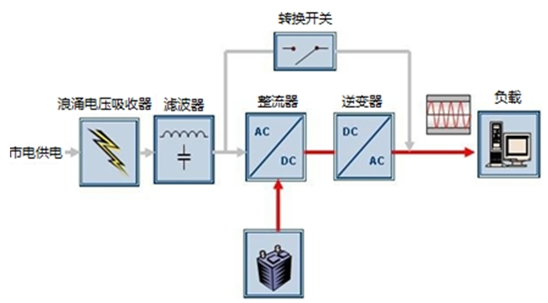 1、市电正常时,交流电通过主电输入端口,交流电输入经整流滤波变换成直流后,再通过SPWM逆变器逆变,然后交流电供给输出,最后通过逆变静态开关切换到用户负载,形成整个供电的通路。在UPS系统中,之所以在市电供电的情况下还需经过整流、逆变等电路,而不是直接由市电给后端的用户负载供电,其目的是提高供电、用电的质量。