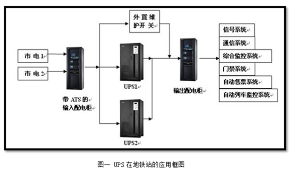 上图是个非常典型的UPS在地铁中的应用,从上图中可以明显看到,该系统包含配电柜、UPS电源和外置维护开关,终端负载为各机电系统,如信号系统、通信系统、综合监控系统、自动售检票系统、自动列车监控系统等子系统。配电柜的作用是对用电设备进行配电和控制,在电路出现过载、短路和漏电时,配电柜还可以进行断电保护;外置维护开关主要是在维护检测过程中闭合,旁路掉UPS的电路,使电能从外置维护开关的电路上通过,实现了在保证后端负载能够得到正常供电的情况下不影响对设备的维护;在市电异常,配电柜断电的情况下,UPS电源通过储能装置给后端的设备供电。