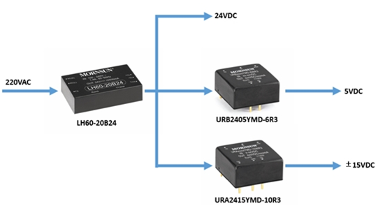 根据各个功能电路的特点,微机处理器、信号输出和脉冲输出的隔离光耦一般采用5V/1A供电,转换A/D采样电路一般为±15V/0.3A,而保护电路中的继电器和后端驱动电路可以采用24V/1A,前端直接通过接入市电供电,公司提供的LH60-20B24\URB2405YMD-6WR3\URA2415YMD-10WR3的开关电源能够解决此处的供电方案,具体的初步方案可以设计如下图六:
